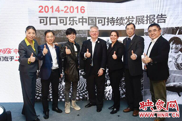 可口可樂中國攜手合作伙伴發(fā)布2014-2016可持續(xù)發(fā)展報(bào)告(左起:可口可樂大中華及韓國區(qū)副總裁張華瑩、壹基金秘書長李勁、創(chuàng)作型歌手王嘯坤、可口可樂大中華及韓國區(qū)總裁馮廣晟、世界自然基金會(huì)全球淡水項(xiàng)目高級(jí)官員Judy Takas、世界自然基金會(huì)中國淡水項(xiàng)目總監(jiān)任文偉博士、可口可樂大中華及韓國區(qū)副總裁張建弢)