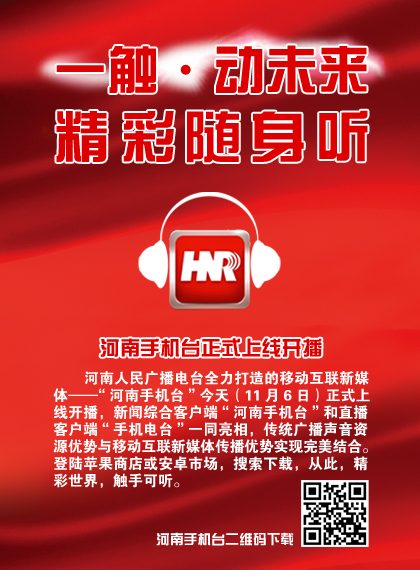 河南人民廣播電臺全力打造的移動互聯(lián)新媒體——“河南手機臺”今天(11.6)正式上線開播,新聞綜合客戶端“河南手機臺”和直播客戶端“手機電臺”一同亮相,傳統(tǒng)廣播聲音資源優(yōu)勢與移動互聯(lián)新媒體傳播優(yōu)勢實現(xiàn)完美結合。登陸蘋果商店或安卓市場,搜索下載,從此,精彩世界,觸手可聽。