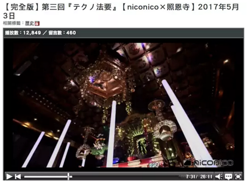 這是日本福井市照恩寺的一場超度儀式,跟以往莊嚴肅穆的宗教儀式相比,這場電音法會顯得極“不正經”。除了用電子音樂誦經、3D全息技術投影、五光十色的照明之外,這場法會還在日本彈幕網站鼻祖 niconico 上進行了直播,引來 1.9 萬人觀看。