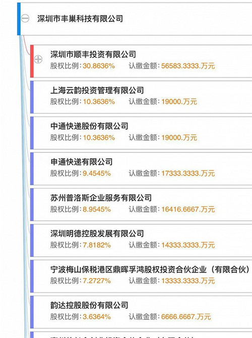 記者在企業(yè)工商信息查詢得知,目前豐巢科技最新的股權(quán)結(jié)構(gòu)為,深圳市順豐投資有限公司為大股東,持股30.8636%,韻達系(上海云韻投資+韻達控股)為第二股東,持股共14%,中通持股10.3636%,申通持股9.4545%。