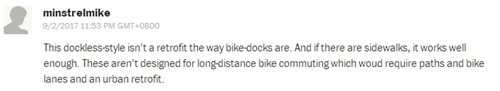 網(wǎng)友minstrelmike:“無樁式共享單車不適合遠(yuǎn)距離的騎行者,解決這個問題還得靠自行車道的規(guī)劃和城市的改造。”