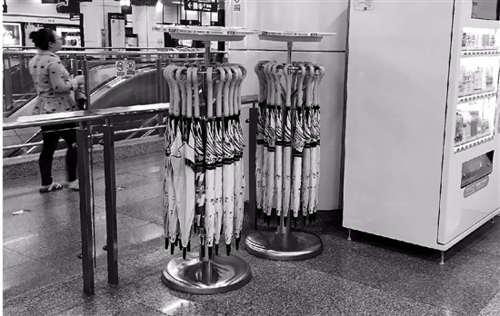 昨天,錢報(bào)記者來到地鐵武林廣場(chǎng)站,在地鐵刷卡入口處附近,就發(fā)現(xiàn)了兩個(gè)圓柱形的架子。架子上掛滿了各式各樣的長(zhǎng)柄雨傘。架子上貼著提示語(yǔ):掃碼借傘。