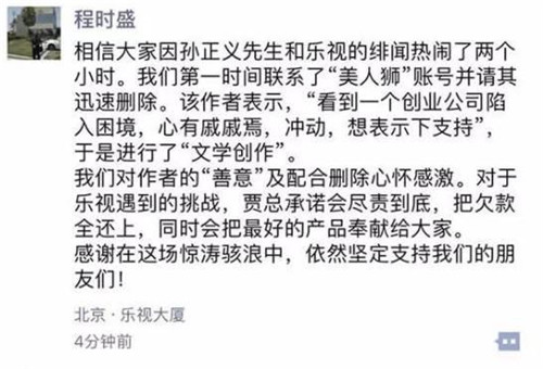 程時盛在朋友圈中寫到:相信大家因?qū)O正義先生和樂視的緋聞熱鬧了兩個小時。我們第一時間聯(lián)系了“美人獅”賬號并請其迅速刪除。該作者表示,“看到一個創(chuàng)業(yè)公司陷入困境,心有戚戚焉,沖動,想表示下支持”,于是進(jìn)行了“文學(xué)創(chuàng)作”。我們對作者的“善意”及配合刪除心懷感激。對于樂視遇到的挑戰(zhàn),賈總承諾會盡責(zé)到底,把欠款全還上,同時會把最好的產(chǎn)品奉獻(xiàn)給大家。感謝在這場驚濤駭浪中,依然堅定支持我們的朋友們!