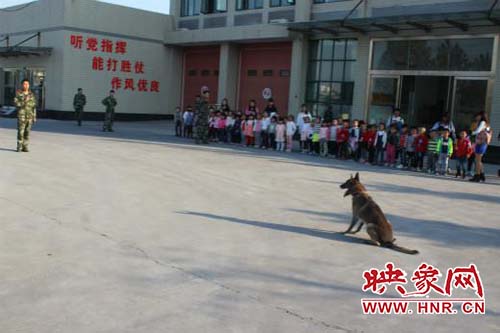 在老師和消防隊(duì)員的帶領(lǐng)下,孩子們有秩序地參觀(guān)。首先參觀(guān)了一樓車(chē)庫(kù),孩子們被消防車(chē)以及車(chē)上的先進(jìn)裝備深深吸引,消防員叔叔耐心細(xì)致地為孩子們講解消防車(chē)上的小秘密:高壓水槍、防毒面罩、氧氣瓶、急救箱、云梯、泡沫噴射槍、定位器、呼救器等消防裝備,使孩子們開(kāi)了眼界。消防隊(duì)員還用淺顯的語(yǔ)言向孩子們介紹了消防常識(shí):火災(zāi)的危害、火災(zāi)的預(yù)防、火災(zāi)發(fā)生時(shí)的逃生自救、消防器械的使用、消防服的穿戴等等。接著孩子們參觀(guān)了二樓的消防員宿舍、圖書(shū)室、會(huì)議室、體育活動(dòng)室等,更深入地了解了消防員的學(xué)習(xí)生活,更加走近消防員。最后,消防員為孩子們帶來(lái)了精彩的警犬搜救表演,孩子們興高采烈,不約而同為消防員叔叔鼓掌叫好!