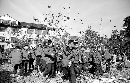 中午,當錢報記者趕到學(xué)校時,被眼前的景象驚到了:150米的環(huán)形操場中間,鋪滿了金黃色的落葉,一群學(xué)生正把落葉滿滿地捧起,再高高地往上一拋,于是只見滿眼的落葉紛飛……