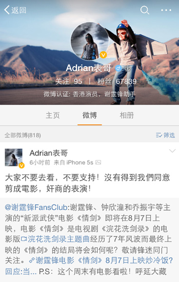 那么,《情劍》的兩位“主演”謝霆鋒與鐘欣桐為什么沒來宣傳本片呢?馬云對此表示:“兩位演員都還有別的戲要拍,沒時間來宣傳我們的電影?!钡皫兹崭勖絾柤傲藘扇说慕?jīng)紀(jì)人霍汶希,對方稱《情劍》片方根本沒有通知他們上映的事,更沒有邀請二人宣傳。而在微博上認(rèn)證為“香港演員、謝霆鋒助手”的網(wǎng)友“Adrian表哥”也發(fā)微博指責(zé)片方并沒有得到謝霆鋒的同意,是奸商行為。另外,記者也查閱了《情劍》的官方微博,該官微在開辦至今僅發(fā)7條微博,有90個粉絲??梢哉f,《情劍》除了一組有“抄襲嫌疑”的海報之外幾乎是在沒有任何宣傳的情況下推進(jìn)院線的。