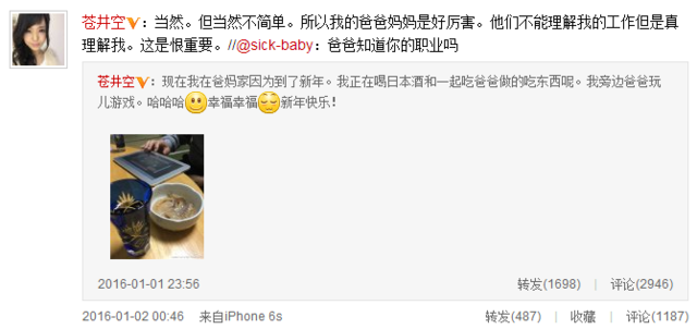 隨后有網(wǎng)友留言,問及“你爸爸知道你職業(yè)嗎?”蒼井空很是坦誠回答:“當(dāng)然。但當(dāng)然不簡單。所以我的爸爸媽媽是好厲害。他們不能理解我的工作但是真理解我。這是很重要。”更有網(wǎng)友敏感地問道:“蒼老師的父親也看過她的作品嗎?”蒼井空反問“如果你爸爸的話怎么樣”讓網(wǎng)友為其機(jī)智點贊。