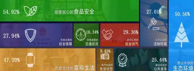 重視“舌尖上的安全”,提到“全面小康社會”最期待的圖景,“健康放心的食品安全”(54.92%)最被百姓看重。其次,山青水綠的生態(tài)環(huán)境(50.56%)和衣食無憂的富裕生活(47.20%)也很重要。