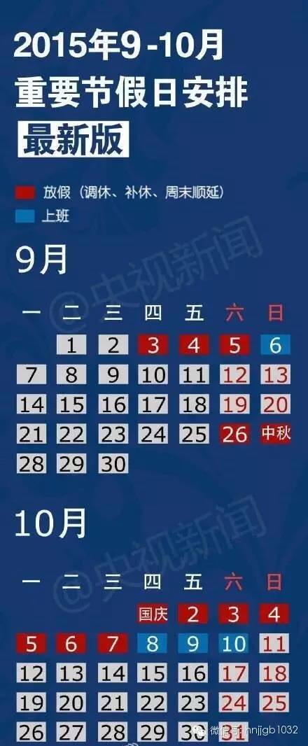 今年國慶節(jié)10月1日至7日放假調(diào)休,共7天;10月10日(星期六)上班,10月11日周日正常休假。這實際是把中秋節(jié)的補假放在了國慶節(jié)一起安排,避免了連續(xù)9天上班。