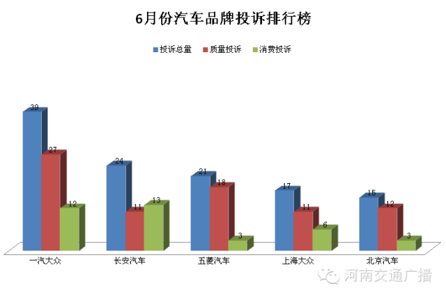 2015年6月份,河南交通廣播《1041維權(quán)直通車》接到汽車投訴418起,本次投訴排行榜上海大眾首次退出了“前三甲”,但一汽大眾仍然一馬當先。
