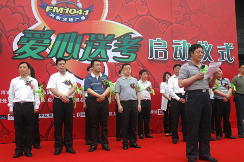 6月4號上午,隨著河南人民廣播電臺總編輯張大寶宣布啟動。河南交通廣播第四屆全省愛心送考大型公益活動正式拉開帷幕。河南省交通運輸廳道路運輸局、河南省公安廳交警總隊、河南人民廣播電臺以及鄭州市教育局、鄭州市交警支隊、鄭州市客運管理處、鄭州市公交總公司等多家單位的領導出席了活動儀式。