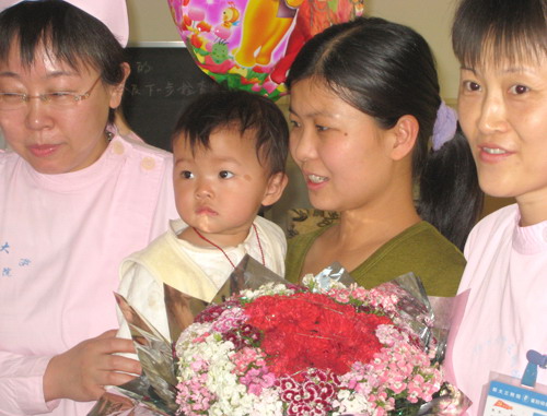 河南省婦幼保健院的醫(yī)護(hù)人員歡送康復(fù)王然出院