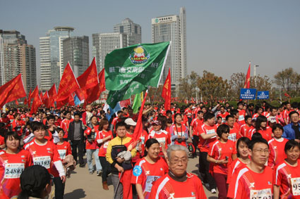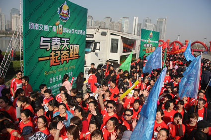 3月27上午,綠城鄭州陽光明媚,春意盎然,2011年中國鄭開國際馬拉松賽分別在鄭州市鄭開大道和鄭東新區(qū)商務內環(huán)鳴槍舉行,來自28個國家和地區(qū)的近3萬名選手參加了比賽。河南交通廣播也組織了由1041名車友組成的“千人跑友團”參賽,大家一起跑進春天,共同慶祝交通廣播成立18周年。