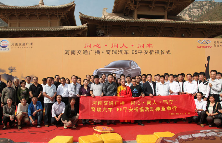 公元2012年10月13日(農(nóng)歷八月二十八)9:36正點(diǎn)時(shí)刻,河南交通廣播“同心?同人?同車—奇瑞汽車 E5平安”祈福活動(dòng)神圣舉行。河南交通廣播為了讓本次祈福活動(dòng)氣氛更好,在更大范圍內(nèi)傳播、弘揚(yáng)禪宗之精神。特把本次活動(dòng)的主要儀式設(shè)置禪文化氛圍濃郁的“禪宗少林·音樂(lè)大典”內(nèi)神圣舉行。