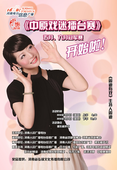 今天(7月3日)09:00-12:00、14:00-17:00,“中原戲迷擂臺賽”五月、六月月冠軍賽將在鄭州德樂相聲社開賽。河南電視臺九頻道12:19(明天07:00)《播報河南》、河南電視臺新聞頻道16:00《中原播報》、明天出版的《東方今報》將對本次比賽進行報道。