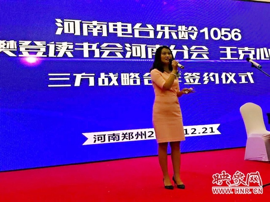 在河南電臺(tái)樂齡1056“說(shuō)說(shuō)心理話”主持人文聰?shù)闹鞒窒?,河南電臺(tái)信息廣播總監(jiān)助理沈建波、樊登讀書會(huì)河南分會(huì)會(huì)長(zhǎng)程海濤、王克心理創(chuàng)始人王克共同簽約了三方合作協(xié)議。