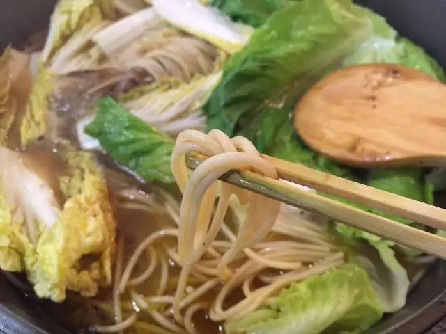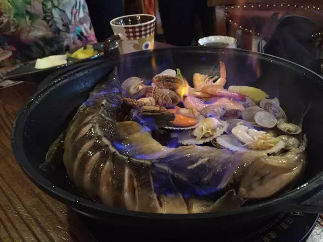 以魚、扇貝、大蝦和時蔬為鍋底,先燜制,后以米酒澆鍋,點火后,能看到火焰在食材上跳躍,聞到淡淡的酒香,最后的醬料可以拌意面吃,有黑椒、麻辣和酸菜三種口味。