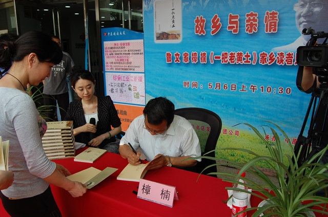 新疆著名散文家樟楠,5月6日在省會中原圖書大廈舉行讀者見面會,并現(xiàn)場簽售新書《一把老黃土》。樟楠原名張可讓,河南靈寶人,現(xiàn)為新疆自治區(qū)黨委宣傳部副部長、《宣傳大視野》雜志總編輯。書中,樟楠深情地描繪了故鄉(xiāng)的人和事,用簡潔的筆法,表達(dá)了作者對家鄉(xiāng)的一片深情.