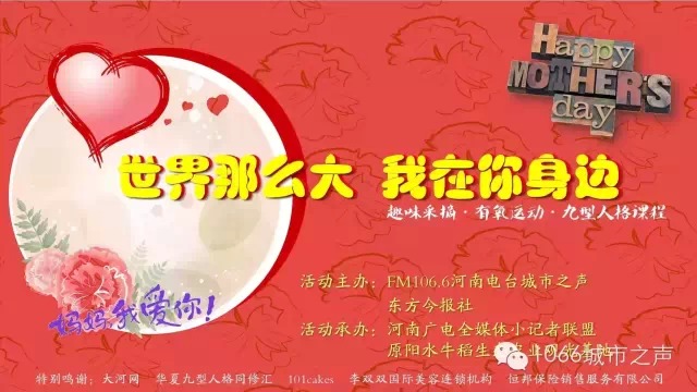 為此,F(xiàn)M106.6河南電臺(tái)城市之聲特別舉辦“世界那么大,我在你身邊”母親節(jié)活動(dòng)。我們還為媽媽們準(zhǔn)備了一份母親節(jié)禮物,九型人格課程“懂她比愛(ài)她更重要”!這份禮物不重,但很暖心。