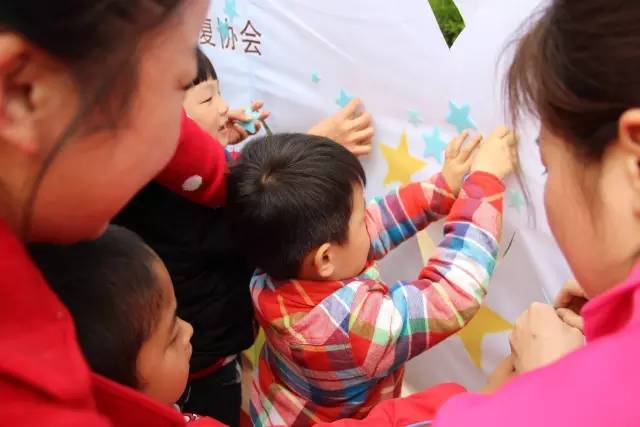 志愿者代表和星兒代表把制作好的小星星粘貼到我們的星星兒童村發(fā)展藍圖上。