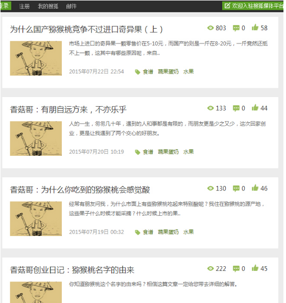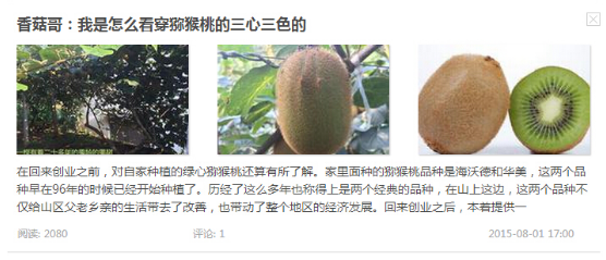 通過這些文章的傳播,我認(rèn)識到了很多的朋友,這些朋友也給我提供了很多的幫助,通過他們我開拓了視野,對獼猴桃有了更加深刻的了解。這些幫助都來自于這些文章的宣傳。雖然有時候晚上熬夜到凌晨的兩三點(diǎn),但是我覺得正是這份辛苦,讓我更加體會到創(chuàng)業(yè)帶來的精神上的收獲。