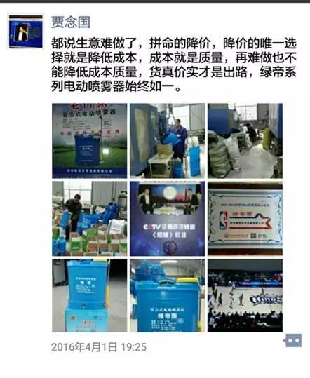 任何一名企業(yè)家,都有困惑的時(shí)候。開始的時(shí)候,生產(chǎn)電動(dòng)噴霧器的公司也就只有他這一家,如今在河南省內(nèi)達(dá)到了100多家,全國的生產(chǎn)廠家有1000多家,賈總覺得目前市場(chǎng)競(jìng)爭(zhēng)是比較激烈的,仿造的甚至是假冒的產(chǎn)品還時(shí)有出現(xiàn);產(chǎn)品的利潤也沒有以前高了;隨著原材料及工人工資等成本的增加,批發(fā)價(jià)格也有所調(diào)高;這一點(diǎn),有時(shí)在賈總的微信里也看出了一些無奈和感慨。