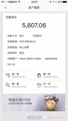 10月19日凌晨,市民王女士被接踵而至的三條信息叫醒,看過之后她睡意全無,這是三條信用卡的消費記錄,記錄顯示自己的招商銀行信用卡共消費8035.97美元,按照匯率差不多是54000元左右。