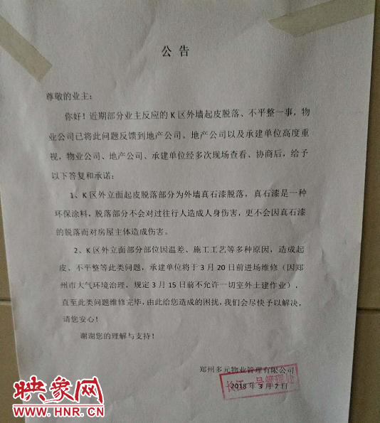 不過(guò),發(fā)稿前,“大象幫辦”記者接到了該小區(qū)物業(yè)的最新消息:為消除業(yè)主的顧慮,他們已在小區(qū)單元門(mén)口張貼公告,向業(yè)主解釋了外立面凸起產(chǎn)生原因,并承諾承建單位工程部將組織維修人員在3月20日之前進(jìn)場(chǎng)維修,直至此類(lèi)問(wèn)題維修完畢。