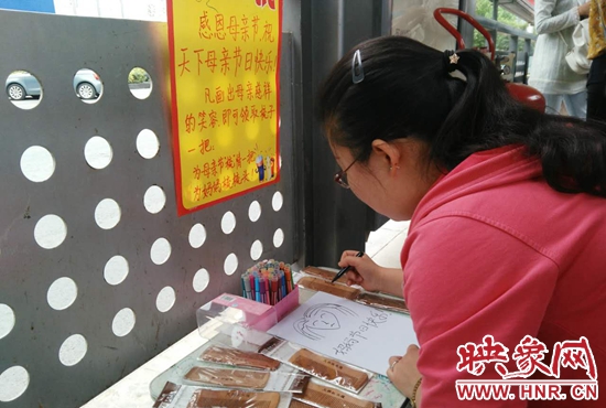 映象網(wǎng)快訊(記者 何葉 文/圖)昨天(5月14日)是母親節(jié),在金水路快速公交站臺內(nèi),別樣的慶祝母親節(jié)活動正在進(jìn)行著,凡是在站臺內(nèi)畫出母親慈祥笑容的乘客,都能獲得梳子一把,為辛勞的母親梳梳頭。