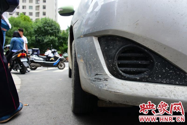 檢查發(fā)現(xiàn),出租車右前車輪前的保險(xiǎn)桿上有幾道清晰的刮蹭痕跡,但出租車司機(jī)否認(rèn)是今天留下的。
