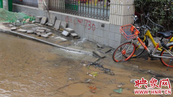 早上6時30分許,未來路辦事處巡防隊員司廣紅等人發(fā)現(xiàn)居民因小區(qū)積水,出行困難,用磚塊鋪路,方便居民進出。由于不明確是自來水管道還是熱力管道發(fā)生了爆裂,巡防隊員也找不到附近的閥門,只好先撥打鄭州城建服務(wù)熱線12319反映此事。