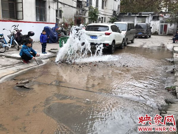 映象網(wǎng)快訊(記者 邱延波 文/圖)11月19日,鄭州桐淮小區(qū)南家屬院19號樓前,因地下自來水主管道爆管導致路面噴出2米多高的“噴泉”,白白浪費掉兩三個小時的自來水。一輛轎車壓住閥門井蓋導致無法關閉閥門,而車主在黃河邊,下午才能回來,工作人員只好把小區(qū)的總閥門關閉。19日上午9時許,桐柏路汝河路口東南角處的桐淮小區(qū)南院19號樓2門洞前的自來水地下管道爆管現(xiàn)場,小區(qū)水泥路邊爛個洞,噴出高高的水柱,小區(qū)道路上全是積水。