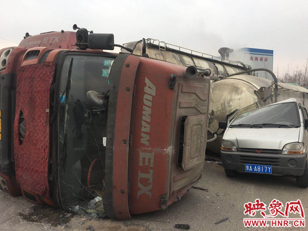 22日上午9時30分左右,江山路與新苑路交叉口東北角,車牌號為豫EX115掛的槽罐車仍然壓在車牌號豫AA817Y的面包車上。槽罐車上裝有40多噸散裝水泥,另一輛趕來救援的槽罐車正在將事故車內(nèi)的水泥轉(zhuǎn)移出來。救援的槽罐車司機說,事故發(fā)生時,槽罐車沿江山路由南向北行駛,走到與新苑路交叉口時,面包車沿江山路由北向東左拐。事故路口沒有紅綠燈,大車司機看到面包車后,立即向右打方向,躲避面包車。由于離心力作用,大車向左側(cè)翻,壓在面包車上,將面包車四分之三壓扁,僅剩駕駛室位置。