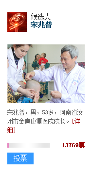 映象網(wǎng)汝州訊(記者 楊增強(qiáng))河南仁醫(yī),感動中國!映象網(wǎng)記者12月26日獲悉,“感動中國”2017年度候選人物已經(jīng)投票已經(jīng)開始,由河南省委宣傳部選報的我省候選人汝州市金庚康復(fù)醫(yī)院院長宋兆普入圍,網(wǎng)友可關(guān)注央視網(wǎng)投票頁面(點(diǎn)擊下圖)為這位河南仁醫(yī)進(jìn)行投票。