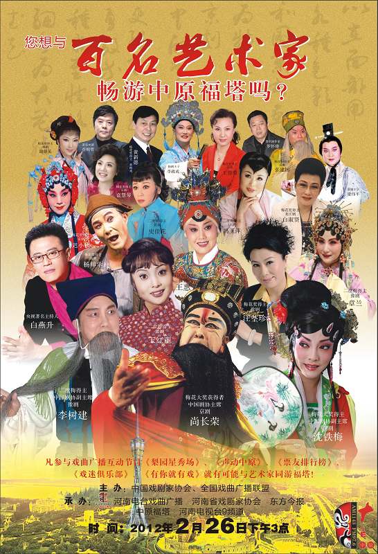 河南電臺(tái)戲曲廣播、河南省戲劇家協(xié)會(huì)發(fā)起并聯(lián)合中國(guó)戲劇家協(xié)會(huì)、全國(guó)戲曲廣播聯(lián)盟共同推出的“全國(guó)百名藝術(shù)家暢游中原福塔”觀光活動(dòng)將于2012年2月26日下午3點(diǎn)舉行。