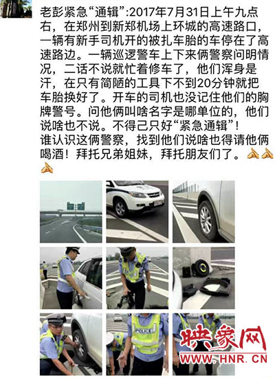 據(jù)介紹,7月31日9時許,河南省公安廳高速交警總隊一支隊執(zhí)勤民警徐玉成、余曉偉巡邏到機場高速與鄭州西南繞城高速互通處附近時,看到北向南方向一輛白色轎車停在高速路邊,上前一看車輛前輪輪胎爆胎了,司機急著去開會卻不會修車,急得滿頭大汗卻無從下手,民警了解情況后,二話沒說在酷暑高溫天氣迅速幫司機把車胎換好,司機連聲表示感謝,由于當(dāng)時急著去開會,沒有來得及問出民警姓名,于是就出現(xiàn)了開頭“緊急通緝”的一幕,公司領(lǐng)導(dǎo)和員工也紛紛轉(zhuǎn)發(fā)正能量,“通緝”找人。伸手幫一把,傳遞正能量一大片。