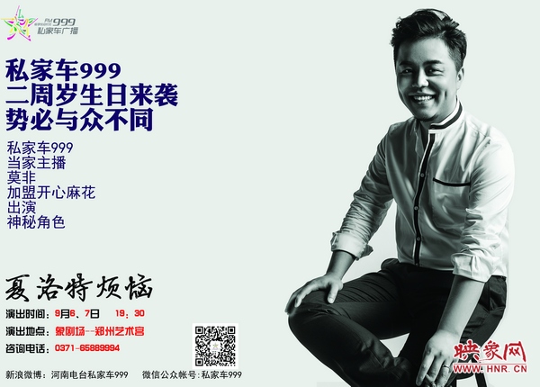 活動(dòng)內(nèi)容:正值私家車999兩歲生日來(lái)臨之際,私家車999特邀開心麻花全國(guó)票房口碑雙料冠軍《夏洛特?zé)馈吩卩嵵菹髣?chǎng)開演,私家車999主持人將擔(dān)綱劇中角色,9月6日、9月7日象劇場(chǎng)鄭州藝術(shù)宮,一起來(lái)過(guò)生日吧!