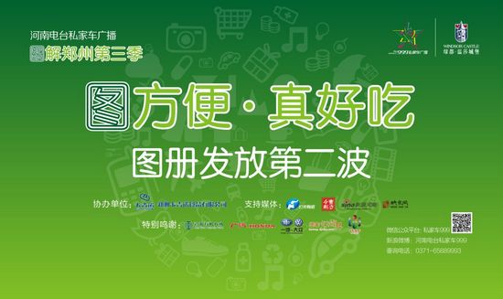 河南電臺私家車廣播2013大型公益系列活動——“圖解鄭州”第三季圖方便·真好吃,圖冊發(fā)放第二波于2013年7月7日在鄭州市東風(fēng)路與天明路交匯處的天旺優(yōu)庫和商都路與七里河南路交匯處的華豐燈飾界免費(fèi)發(fā)放。