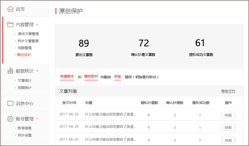 一點(diǎn)號(hào)、鳳凰號(hào)為自媒體用戶提供原創(chuàng)文章版權(quán)保護(hù)功能。 其中,鳳凰號(hào)將于月末開(kāi)啟維權(quán)賠付功能,通過(guò)后臺(tái)監(jiān)測(cè)200+主流平臺(tái),對(duì)侵權(quán)抄襲行為一查到底替作者維權(quán)。未來(lái)一點(diǎn)號(hào)、鳳凰號(hào)將會(huì)全力打造原創(chuàng)優(yōu)質(zhì)內(nèi)容的版權(quán)保護(hù)平臺(tái)及監(jiān)測(cè)網(wǎng)絡(luò),對(duì)于站內(nèi)文章被站外的抄襲也會(huì)進(jìn)行相關(guān)維權(quán)工作。