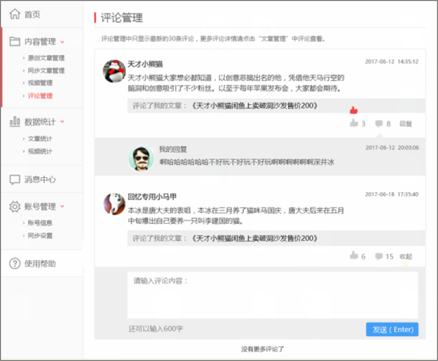 本次積分系統(tǒng)升級(jí)之后,一點(diǎn)號(hào)、鳳凰號(hào)的作者將會(huì)更方便快捷的在后臺(tái)查看用戶評(píng)論,參與用戶討論回復(fù),點(diǎn)贊自己欣賞的讀者評(píng)論,能夠更全面更多元化的與讀者進(jìn)行互動(dòng)。