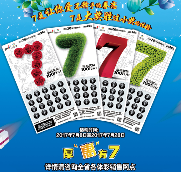 體驗(yàn)頂呱刮新票“7”,新感覺贏大獎(jiǎng),樂在“7”中;邂逅在最美的季節(jié),購(gòu)新票拿好禮,“7”樂無窮!