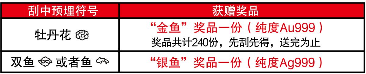 活動(dòng)期間,彩民在我省任一體彩銷售網(wǎng)點(diǎn)購(gòu)買30元面值“富貴有余”主題即開票,若單張彩票刮出符合獎(jiǎng)勵(lì)條件的預(yù)埋符號(hào),并經(jīng)兌獎(jiǎng)設(shè)備(IVT或BCR等)完成掃描確認(rèn)(促銷兌獎(jiǎng))且剪角處理后,即可獲贈(zèng)精美獎(jiǎng)品一份,詳見下表: