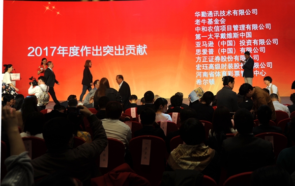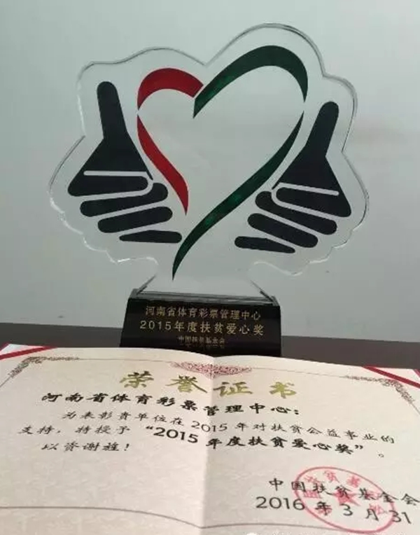 河南省體育彩票管理中心榮獲中國(guó)扶貧基金會(huì)“2017年度扶貧突出貢獻(xiàn)獎(jiǎng)”,中心黨支部書(shū)記王海新代表單位領(lǐng)取了獎(jiǎng)杯和證書(shū)。