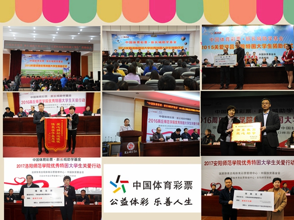 河南省體育彩票管理中心自2013年開(kāi)始,已經(jīng)連續(xù)五年通過(guò)國(guó)家體育總局體育彩票管理中心與中國(guó)扶貧基金會(huì)合作,以“中國(guó)體育彩票·新長(zhǎng)城助學(xué)基金”形式,向信陽(yáng)師范學(xué)院、河南師范大學(xué)、許昌學(xué)院、商丘師范學(xué)院、周口師范學(xué)院、洛陽(yáng)師范學(xué)院、安陽(yáng)師范學(xué)院共計(jì)7所院校的400名優(yōu)秀貧困大學(xué)生累計(jì)捐助助學(xué)金200萬(wàn)元。2015年,河南體彩中心在前兩年每年捐助50名貧困大學(xué)生的基礎(chǔ)上,將受助名額增加到了60名,2016年開(kāi)始又將捐贈(zèng)學(xué)校從一所增加到兩所,受助學(xué)生名額從60名又增加到120名,每個(gè)學(xué)生的受助金額從4000元提高到了5000元,希望幫助更多的困難學(xué)生及其家庭減輕經(jīng)濟(jì)負(fù)擔(dān)和精神壓力。