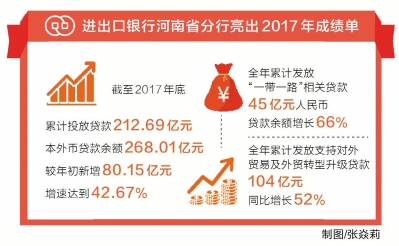 1月29日,進(jìn)出口銀行河南省分行行長吳啟金表示,過去一年,分行努力貫徹習(xí)近平新時代中國特色社會主義思想,助力河南打造內(nèi)陸開放新高地。截至2017年底,進(jìn)出口銀行河南省分行累計投放貸款212.69億元,本外幣貸款余額268.01億元,有力助推我省企業(yè)“走出去”。