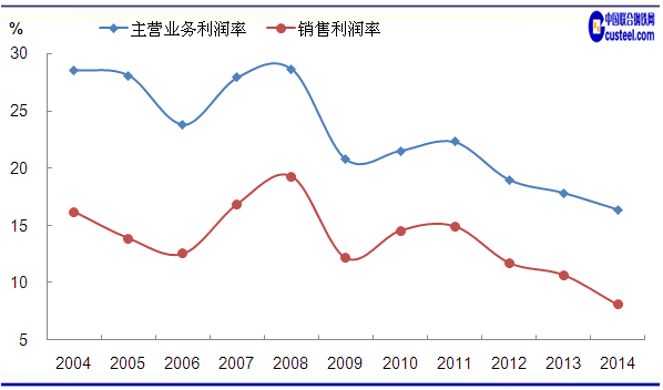 圖2 2004-2014年鐵礦采選業(yè)主營業(yè)務(wù)利潤率和銷售利潤率變化走勢(shì) 數(shù)據(jù)來源:中國統(tǒng)計(jì)局