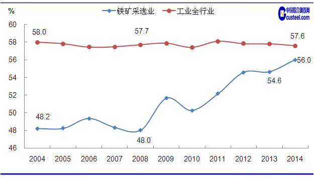 圖4 2004-2014年鐵礦采選業(yè)及工業(yè)全行業(yè)資產(chǎn)負(fù)債率變化走勢(shì) 數(shù)據(jù)來源:中國統(tǒng)計(jì)局