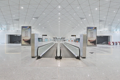 機場二期GTC分為地上兩層,地下四層,鄭機城鐵新鄭機場站位于地下三層。目前,GTC與T2航站樓直接相連,新鄭機場站地上六米處,與T2航站樓到達層相連。車站共設(shè)有3個出入口,1號出入口直通T1航站樓(約50米),2號出入口直通T2航站樓(無縫銜接),3號出入口直通規(guī)劃建設(shè)的T3航站樓。