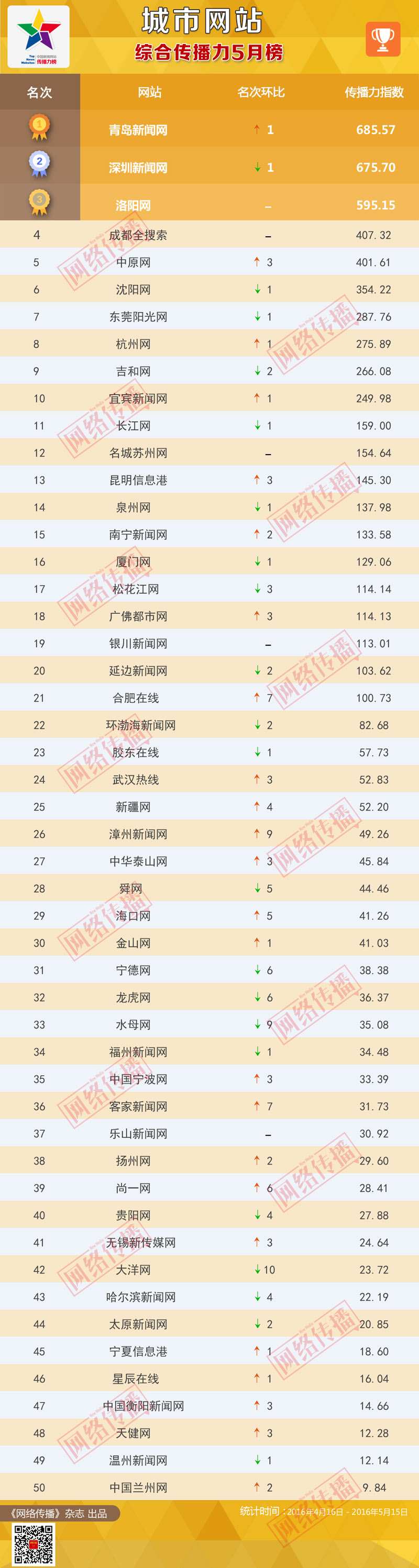 中央網(wǎng)信辦《網(wǎng)絡傳播》雜志傾力打造的“城市網(wǎng)站傳播力2016年5月榜”今日正式發(fā)布。榜單顯示,青島新聞網(wǎng)、深圳新聞網(wǎng)、洛陽網(wǎng)位列綜合傳播力榜前三甲;青島新聞網(wǎng)、深圳新聞網(wǎng)、成都全搜索位居PC端傳播力榜前三名;兩微傳播力榜前三名分別是洛陽網(wǎng)、中原網(wǎng)、成都全搜索。