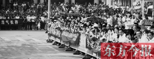 此時,在溫縣殯儀館到溫縣烈士陵園的十幾公里的道路上,早已聚集起了自發(fā)前來送申亮亮最后一程的10萬余名群眾。他們有的胸佩絹花為烈士禱告,有的垂首肅立向烈士致敬,有的眼含熱淚向遠(yuǎn)去的靈車行注目禮,盡管他們中絕大多數(shù)此前和申亮亮并不相識,但他們?nèi)杂酶髯圆煌姆绞絹肀磉_(dá)著對英雄的不舍。